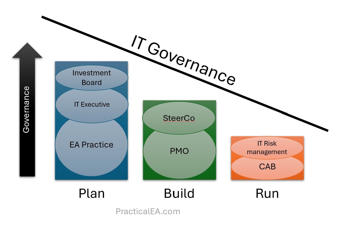 In the Run space, operational governance takes precedence—CAB and IT Risk Management ensure stability, continuity, and safe day-to-day operations.